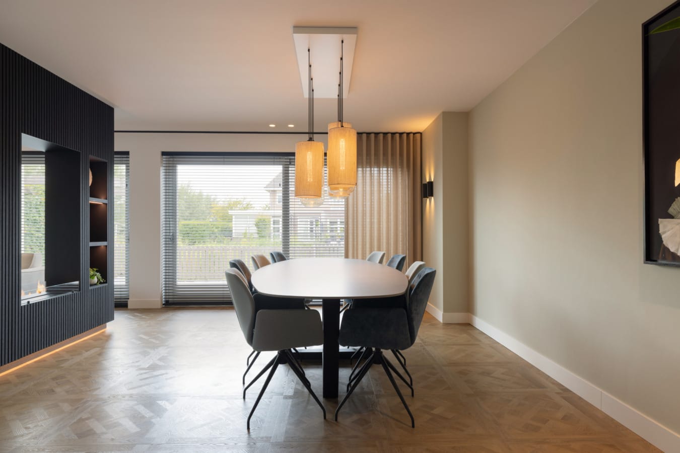 Door het weghalen van de muur oogt de ruimte optisch groter. Een transparante roomdivider in de vorm van een doorkijkhaard scheidt de eet- en woonkamer op speelse wijze, zonder dat het open karakter verloren gaat.