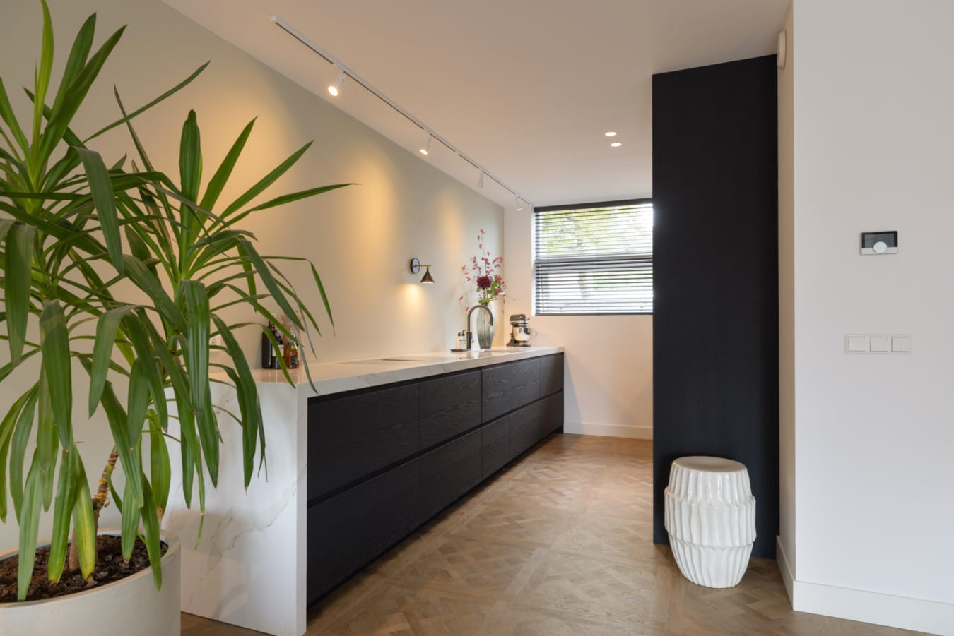 Het interieur is een balans tussen lichte tinten met donkere accenten, waarbij daglicht een belangrijke rol speelt. De uitbouw is voorzien van twee prachtige, grote schuifpuien. Om de lichtinval te reguleren, hebben de bewoners gekozen voor efficiënte aluminium jaloezieën in een donkere kleur.