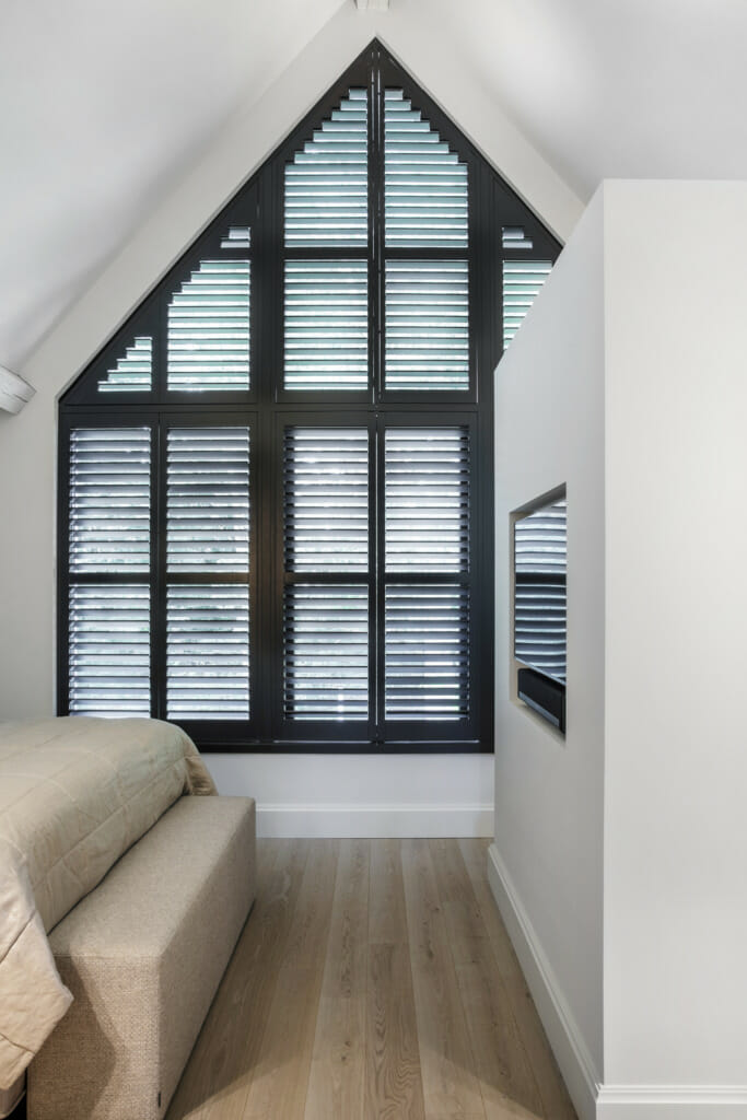 Trapeze ramen, ook wel ramen met schuine zijdes, zijn tegenwoordig erg populair. Een prachtige ruime slaapkamer, waar het plafond tot de nok aan toe loopt. Shutters zijn een uitstekende oplossing voor schuine ramen. Ze worden op maat gemaakt, hierdoor passen ze perfect bij welk raam dan ook. Je kantelt de lamellen om het daglicht eenvoudig te reguleren.