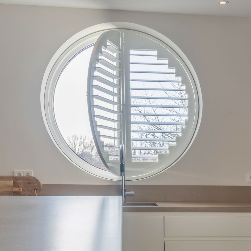 De ideale raambekleding voor een rond raam zijn shutters. Ze worden binnen eigen fabriek op maat gemaakt, waardoor het altijd passend is voor jouw raam. Er zijn twee opties voor shutters bij een rond raam, half open of volledig open. Dit heeft te maken met het kantelen van de lamel.